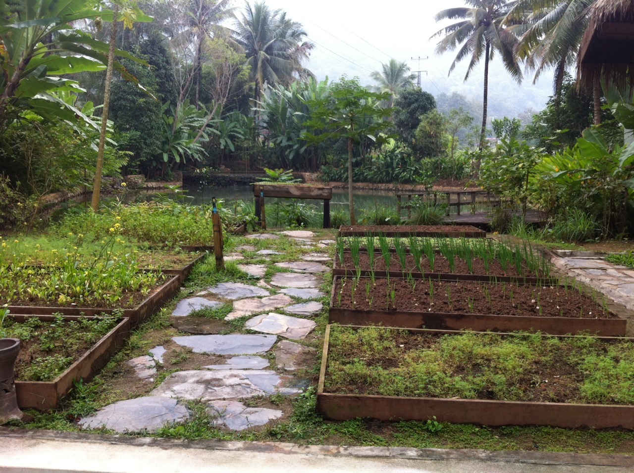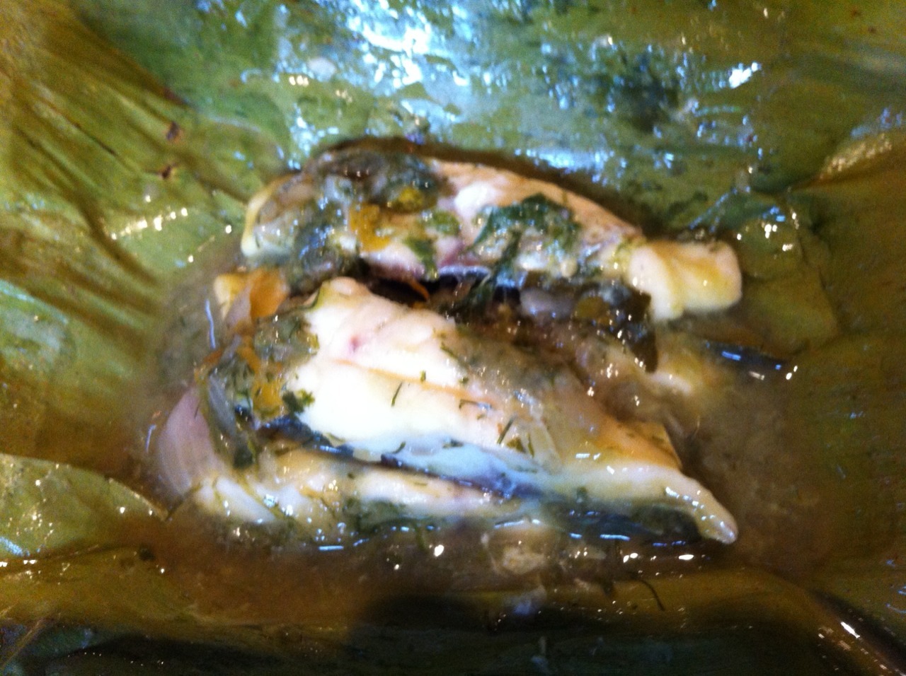 Also on the menu: chicken and herb stuffed lemongrass (gently make a series of slices along the lemongrass stalk to create a “basket”, then bash together herbs and spices and chicken, and spoon the mix into the basket and deep fry), fish in a banana leaf (bash together herbs and spices, stir in fish slices, put into leaf packet and steam) and a coconut milk red rice pudding with fruit and tamarind sauce.