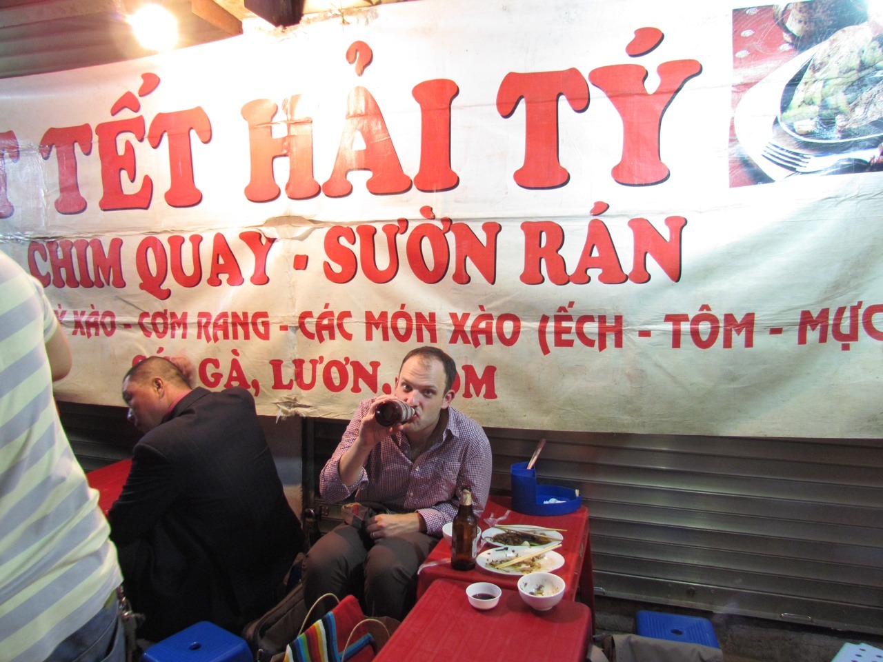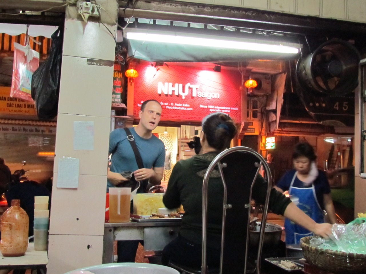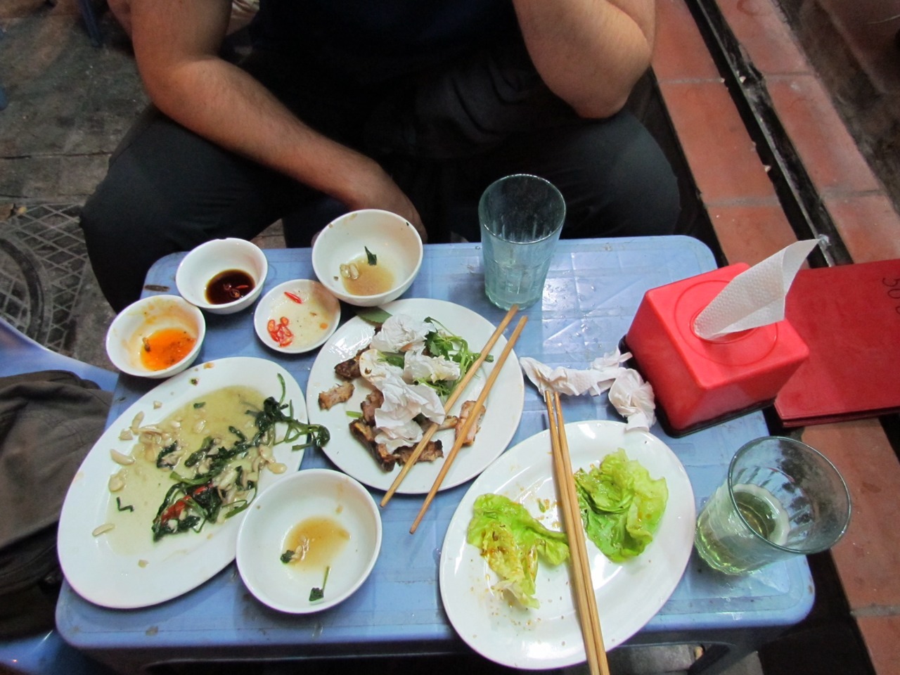 Ambiance consisted of tiny plastic stools and tables in shop fronts and on the pavement, mopeds whipping on by. No meal for more than $4 a head, with a slight additional cost in worrying whether we may have pushed the food hygiene limits too far this time.