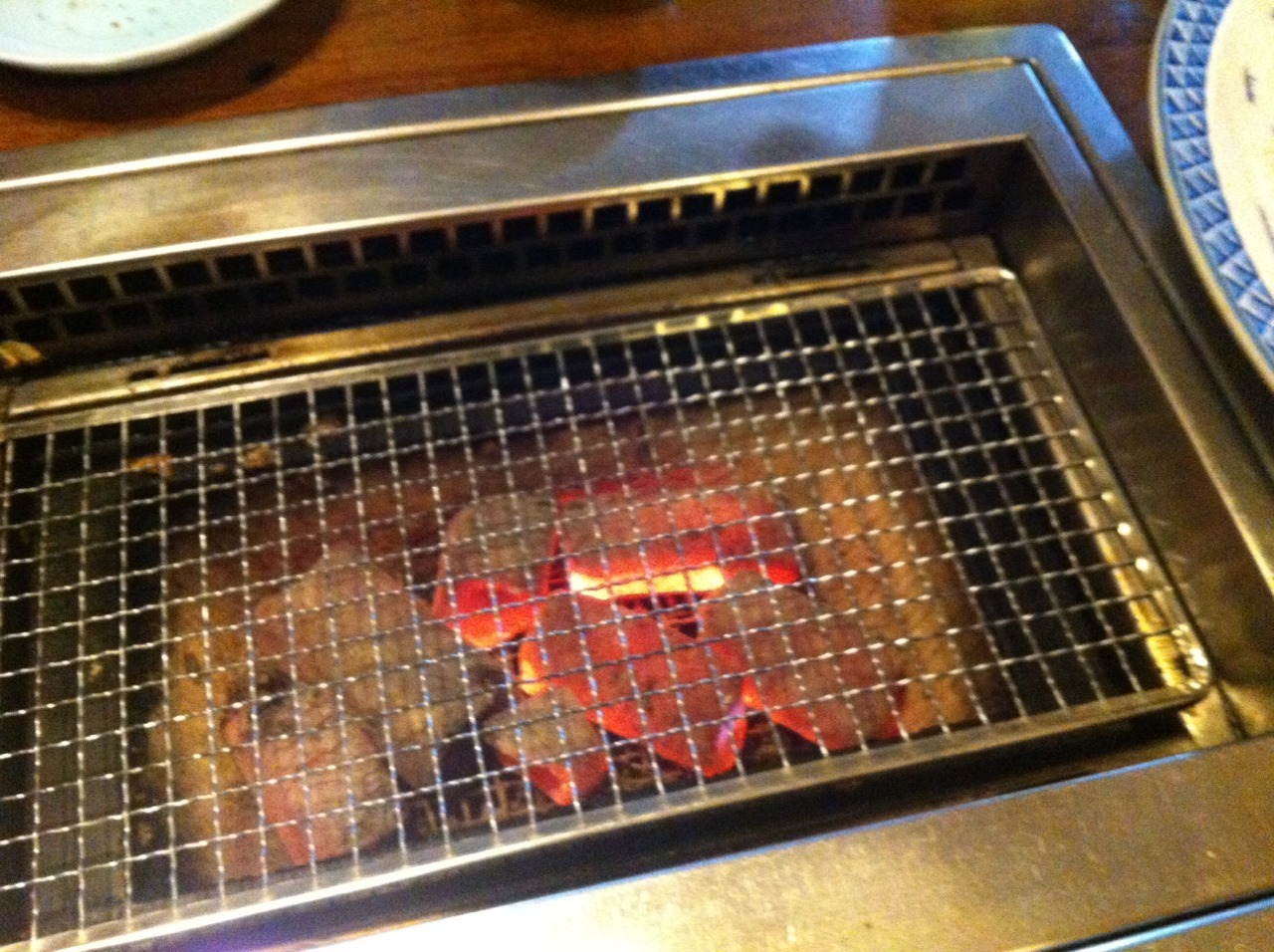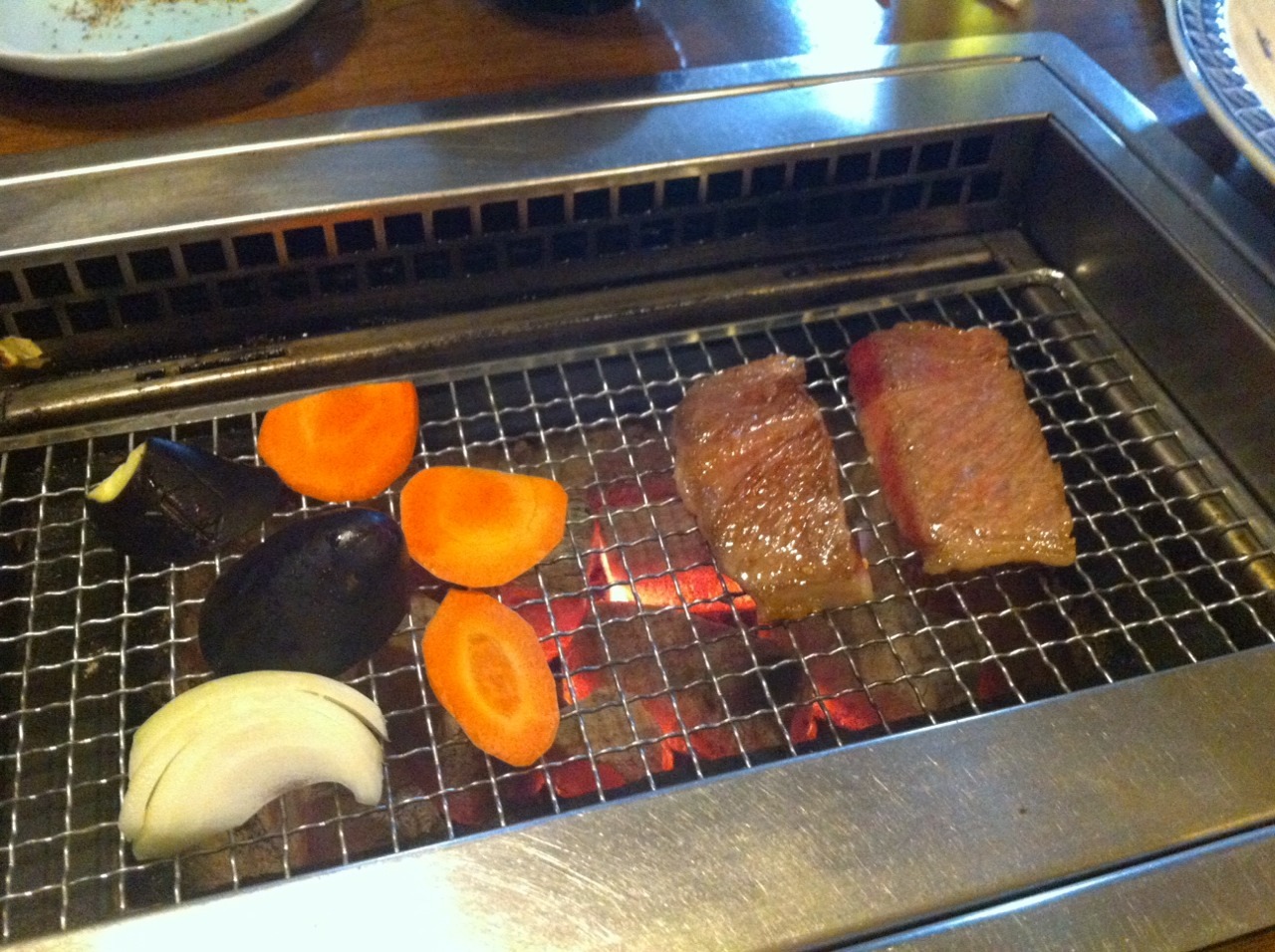 For dinner, we went for grill-your-own Hida-gyū. You select your cut of beef from the refrigerator case and they bring it out for you in slices, along with some red-hot charcoal for the grill. After that, you’re on your own.