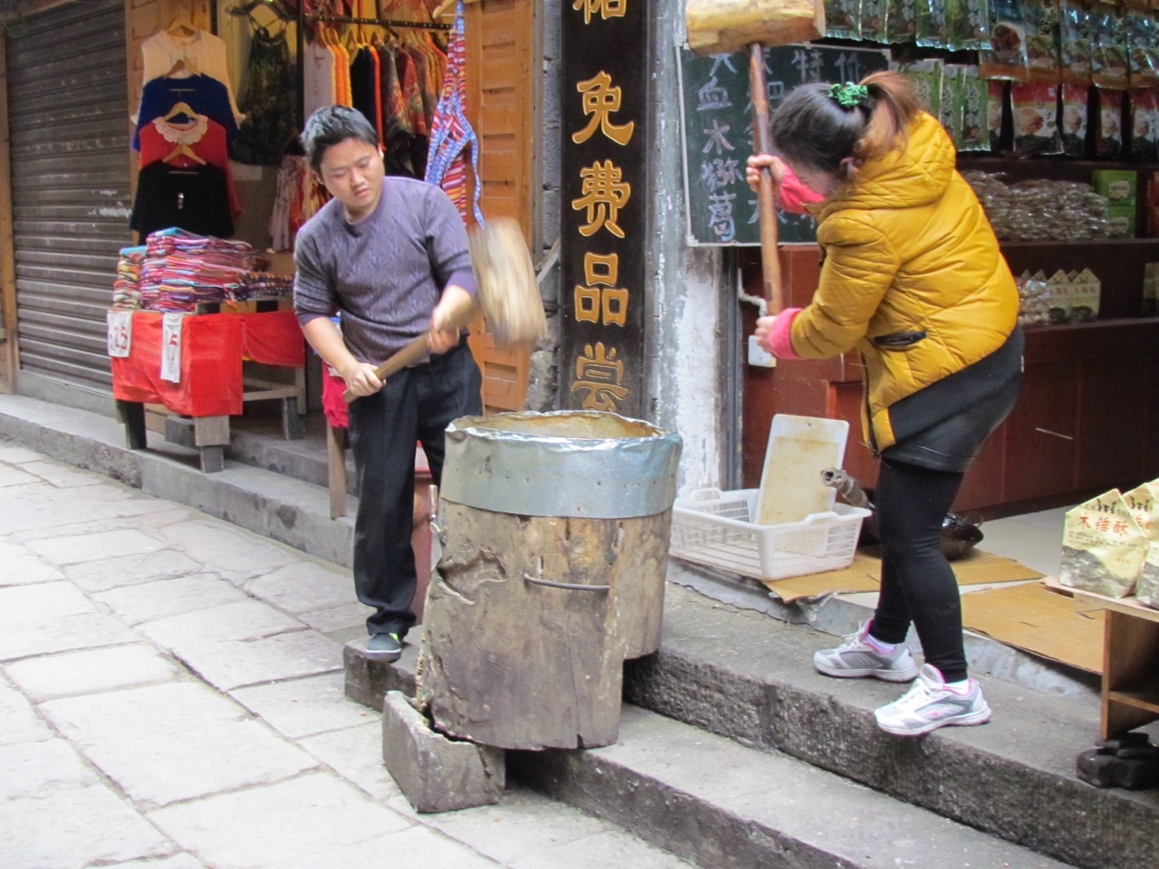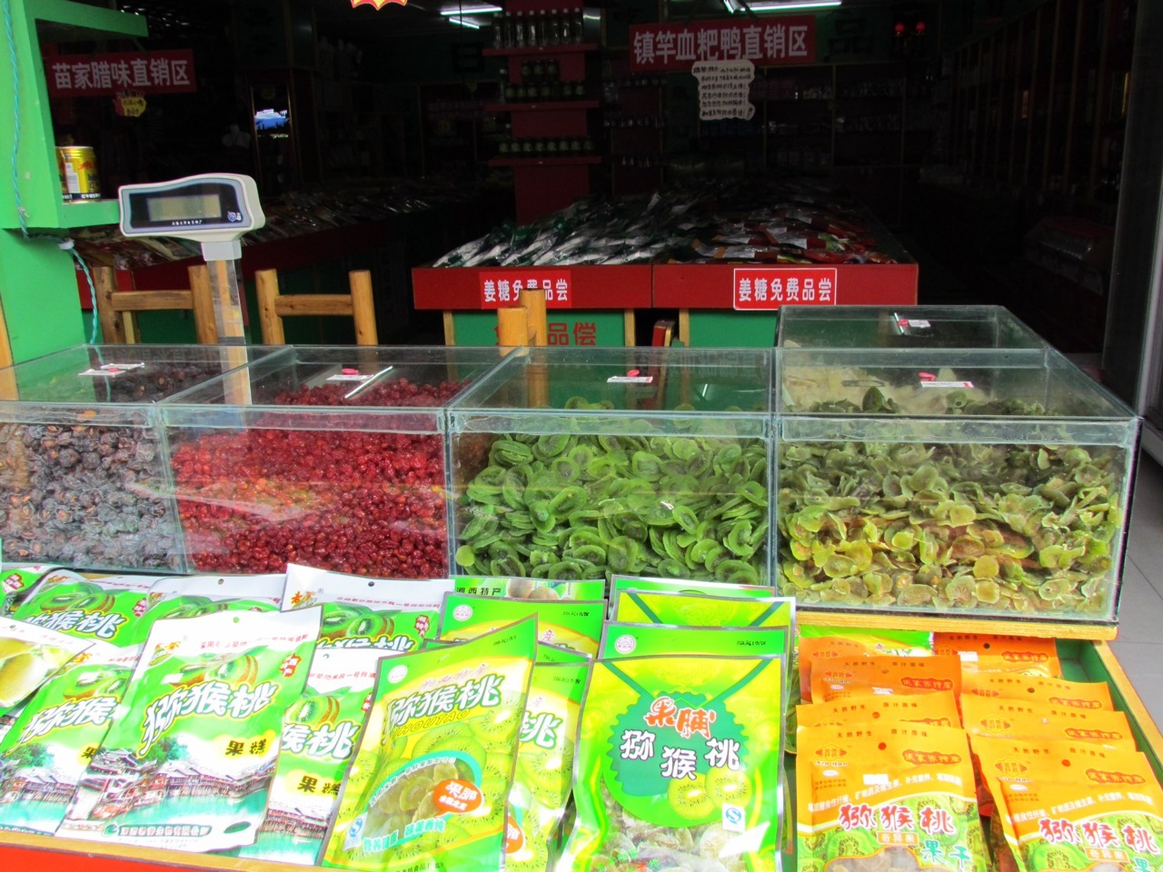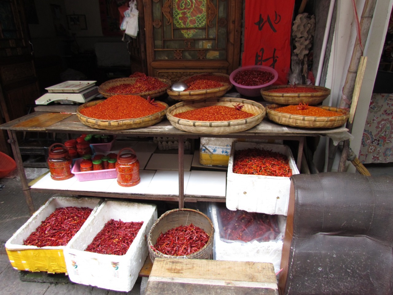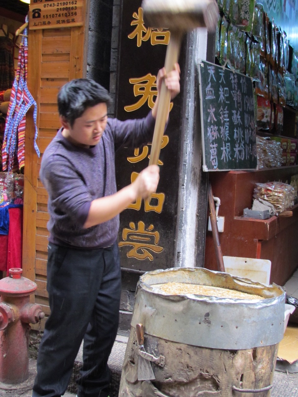I wouldn’t say you go to Fenghuang for the food, exactly (bizarrely, it seems most Chinese tourists go for the clubbing). But there were plenty of interesting eats on offer: small stalls frying up food on demand, chilies befitting Hunan’s spicy reputation, a startling variety of dried animals, a preponderance of dehydrated kiwi (why?), omnipresent sugared nuts being pounded into a candy, and dinner features still on the hoof/claw/paw/webbed foot.