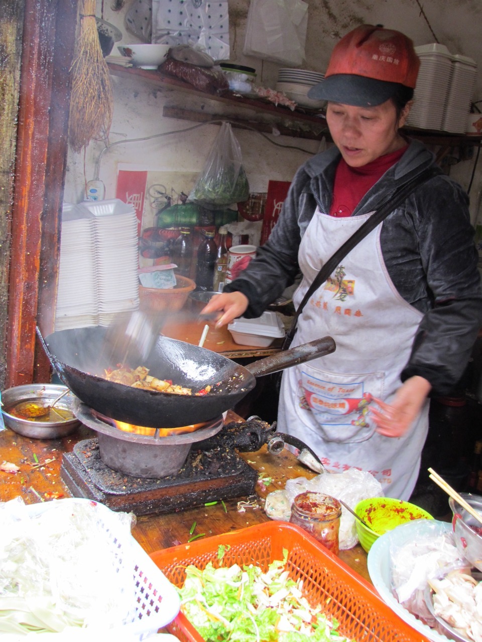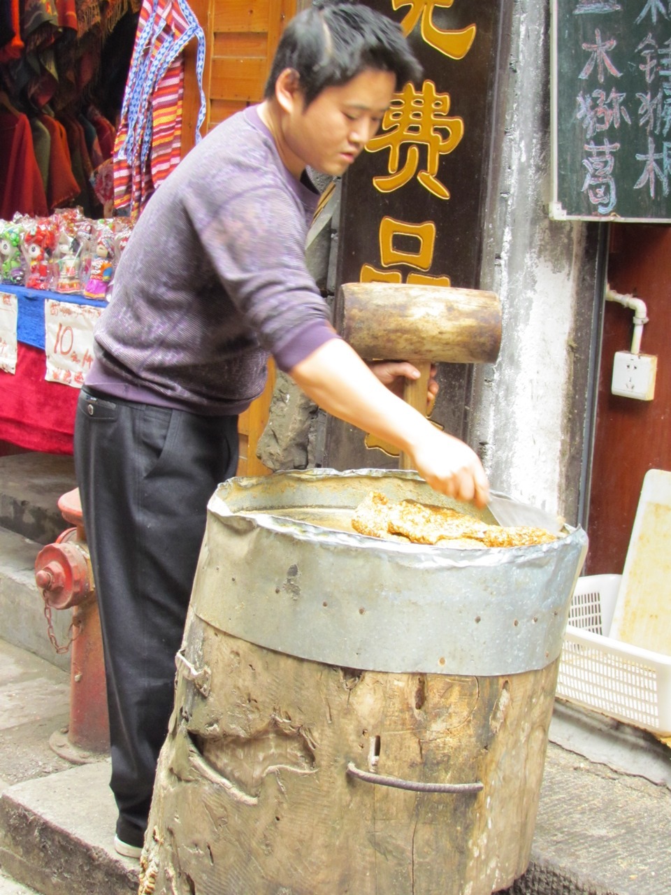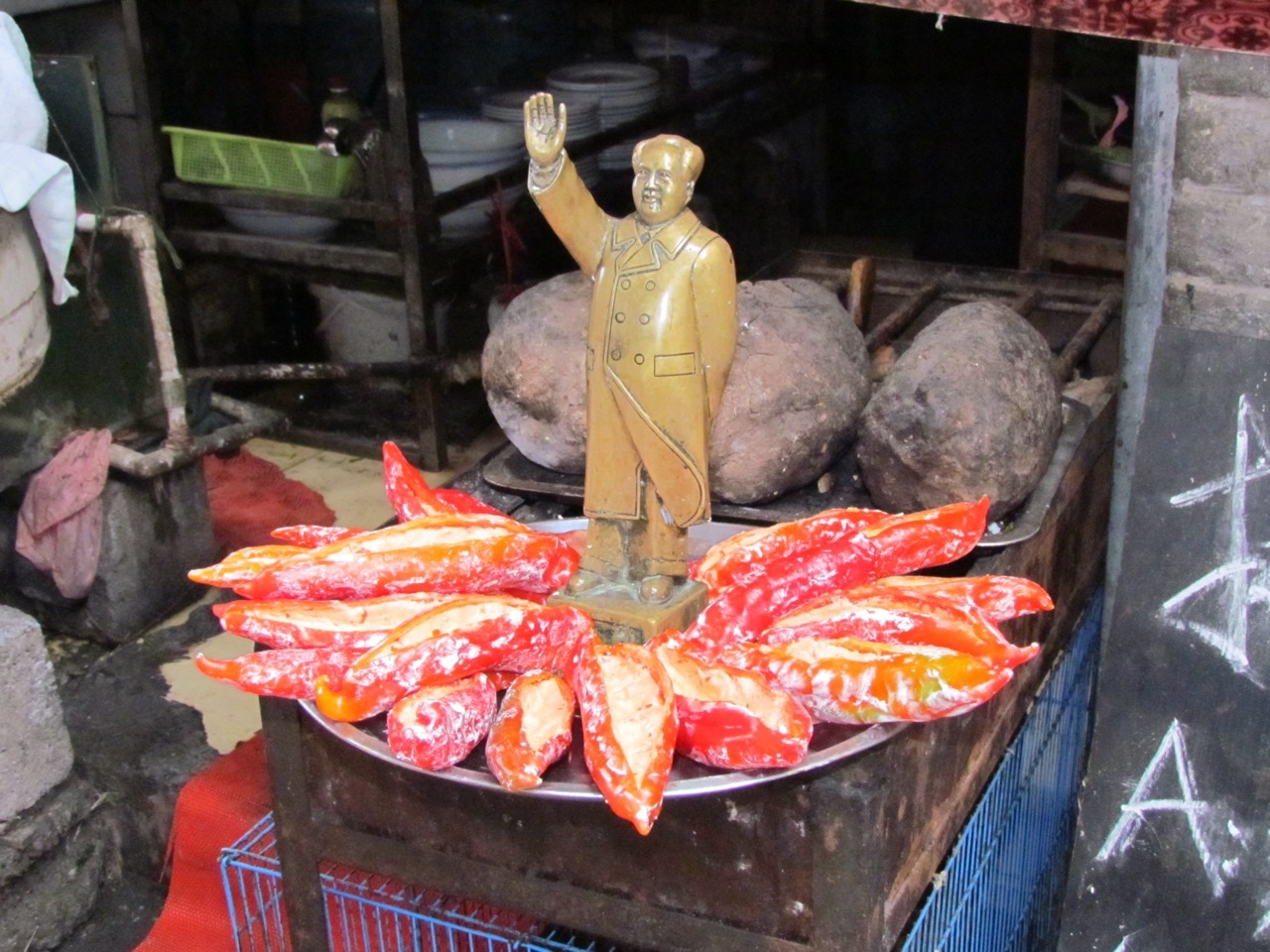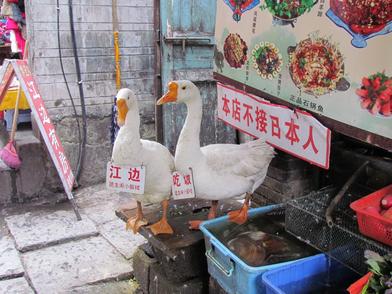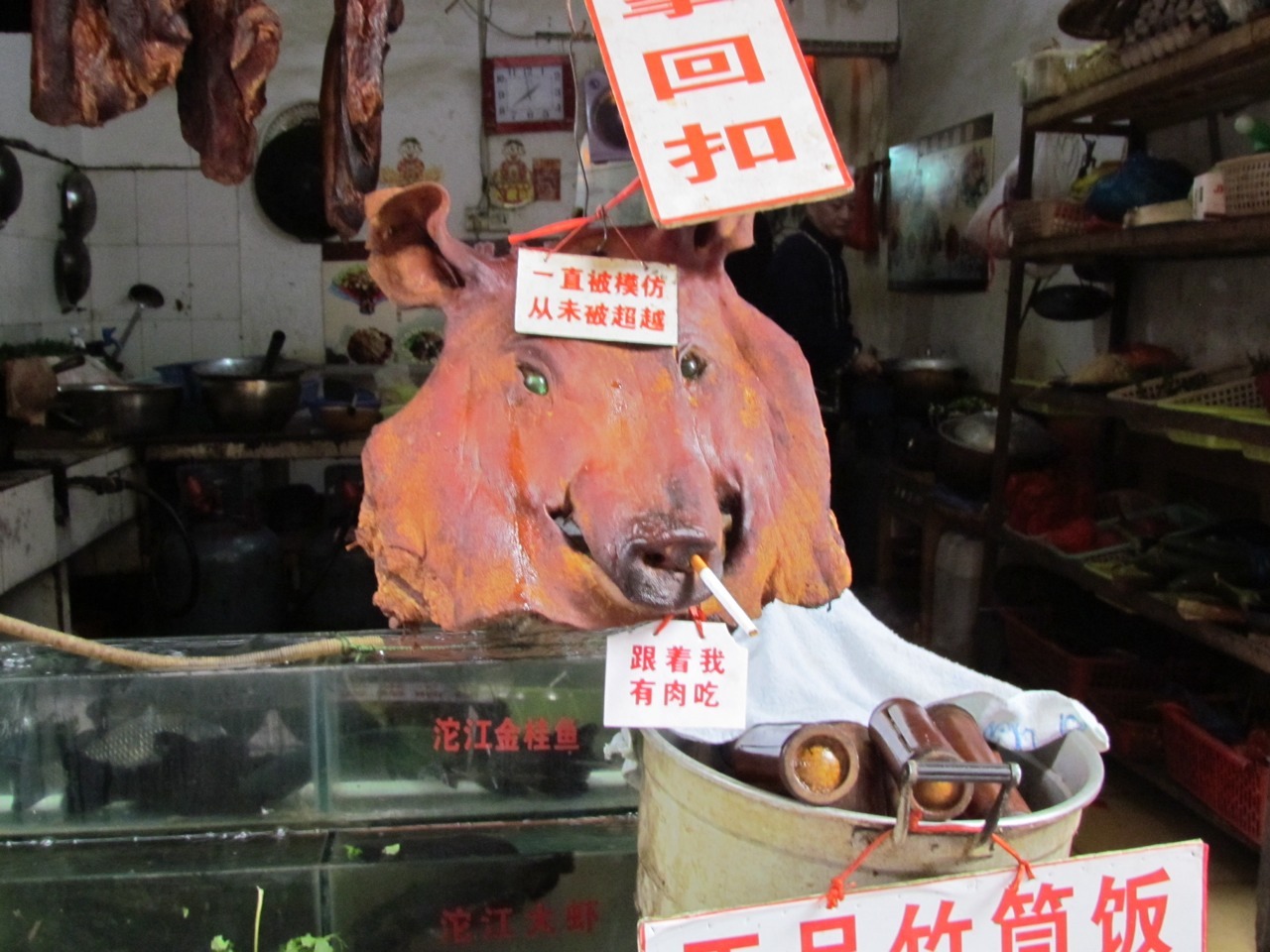 I wouldn’t say you go to Fenghuang for the food, exactly (bizarrely, it seems most Chinese tourists go for the clubbing). But there were plenty of interesting eats on offer: small stalls frying up food on demand, chilies befitting Hunan’s spicy reputation, a startling variety of dried animals, a preponderance of dehydrated kiwi (why?), omnipresent sugared nuts being pounded into a candy, and dinner features still on the hoof/claw/paw/webbed foot.