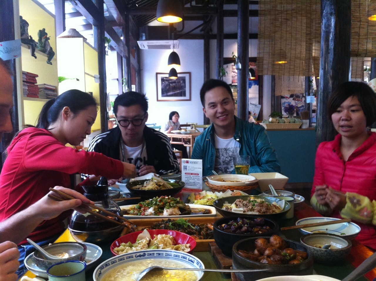 One of those random things that sometimes happen: we were lolling around in the hostel café in Hangzhou. I was still recovering from my sickness, the weather was a bit minging, and we were really just waiting until it was time to catch the sleeper train to Changsha. Then the café staff approached and asked us if we would be willing to appear in a TV show about their restaurant in exchange for free lunch.