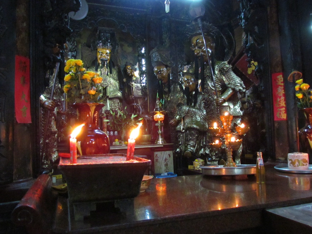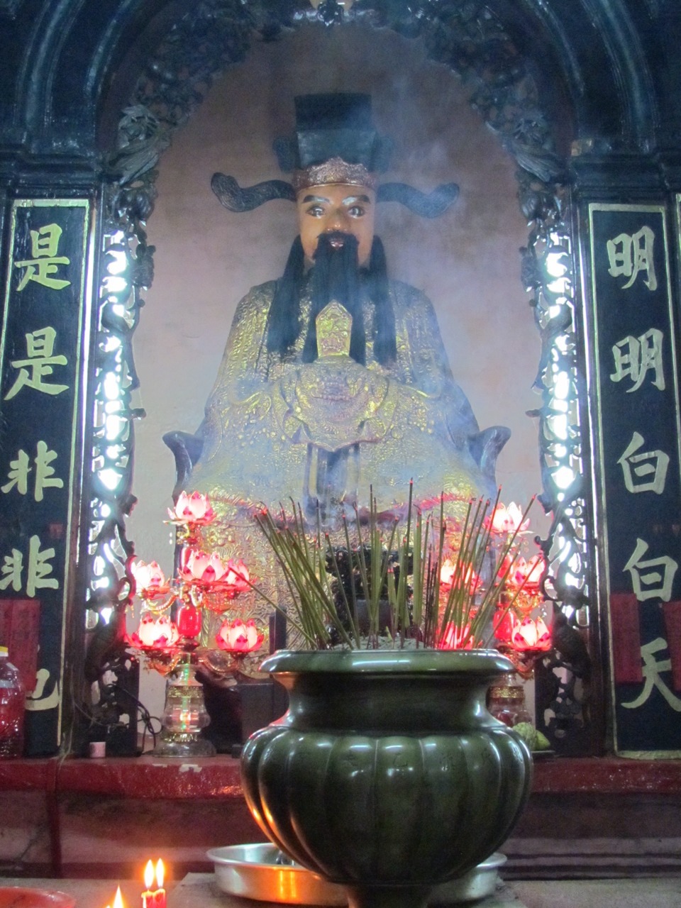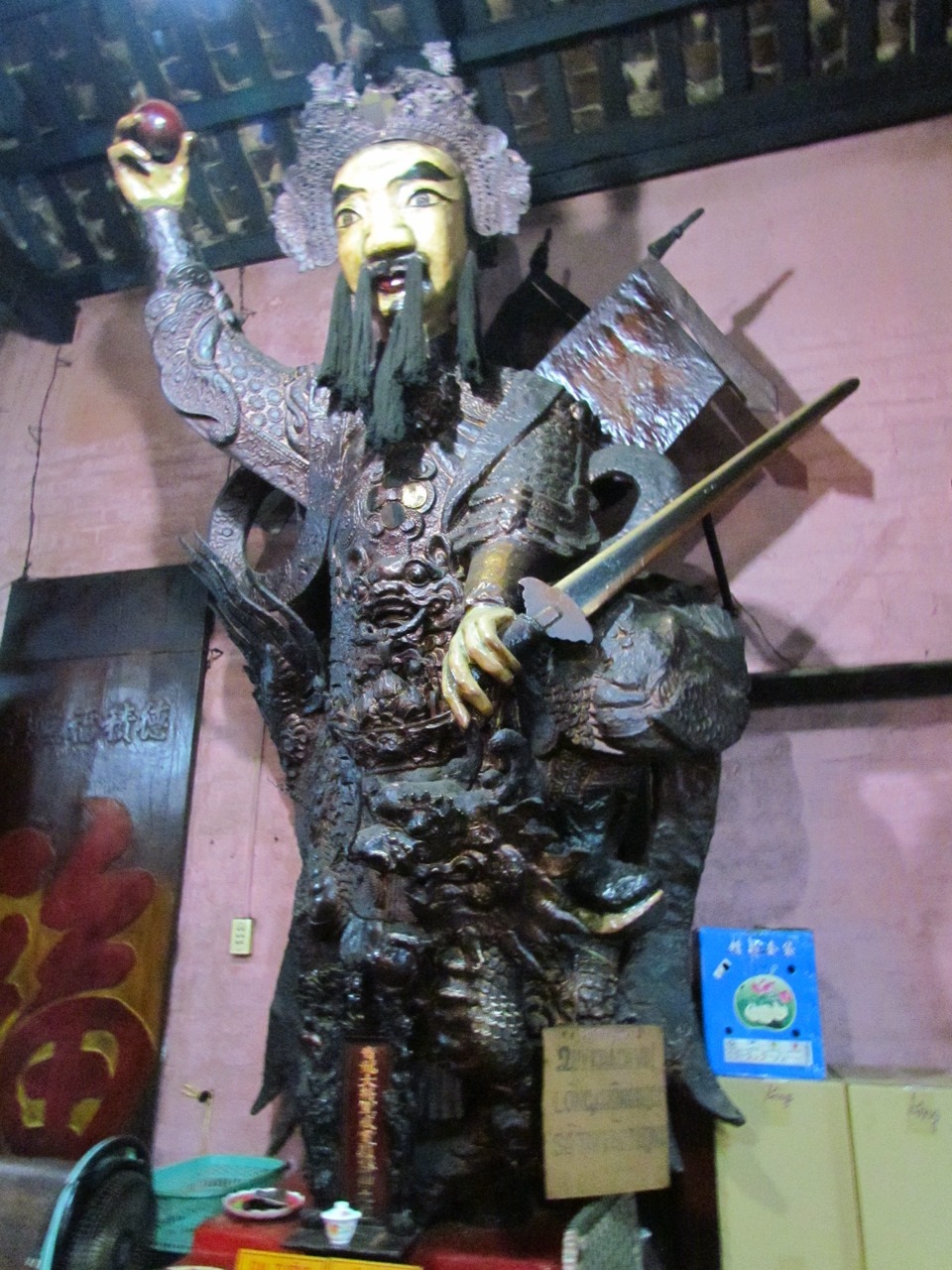 The Jade Emperor Pagoda in HCMC is a weird little spot, especially compared with previous temples on our itinerary. It is very dark and the air is thick with incense, and most of the divinities, etc. are made of papier mâché. The Jade Emperor/King of Heaven is on the left-hand side of the top photo, but you can also drop in on the Chief of Hell (second photo). Bottom photo is some generic good bloke who defeated the Green Dragon. But he looks cool!