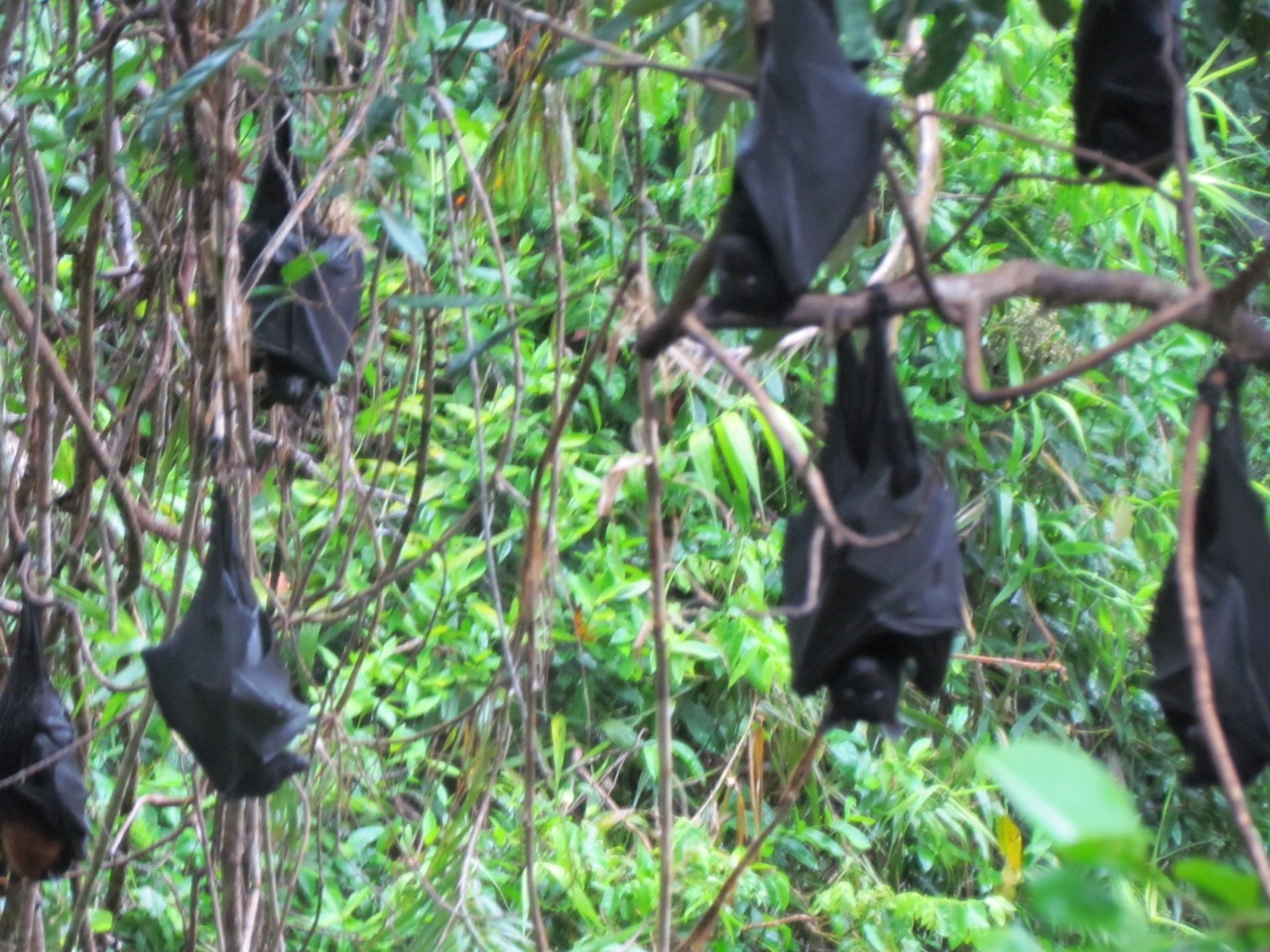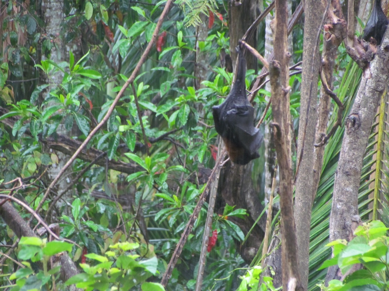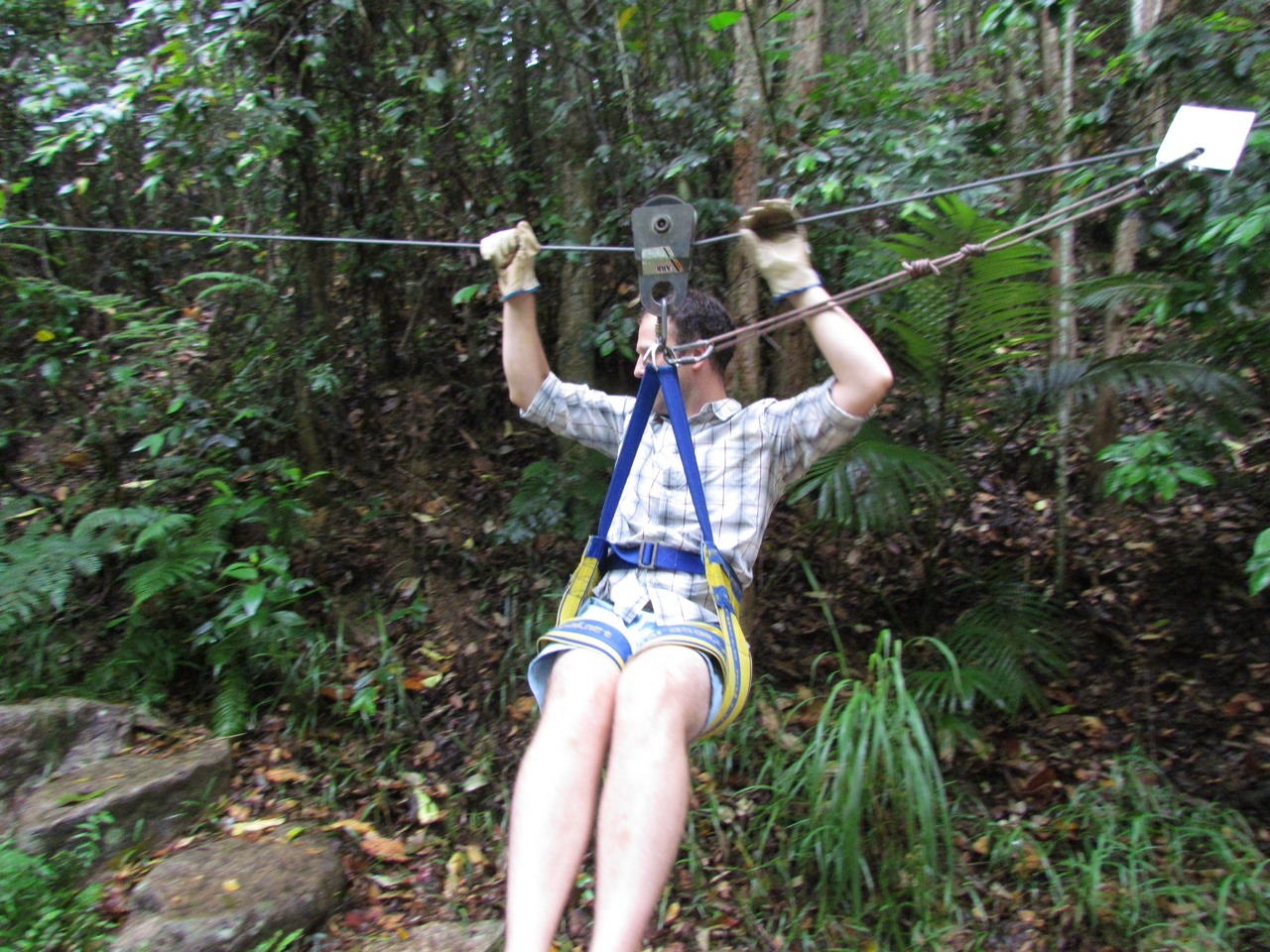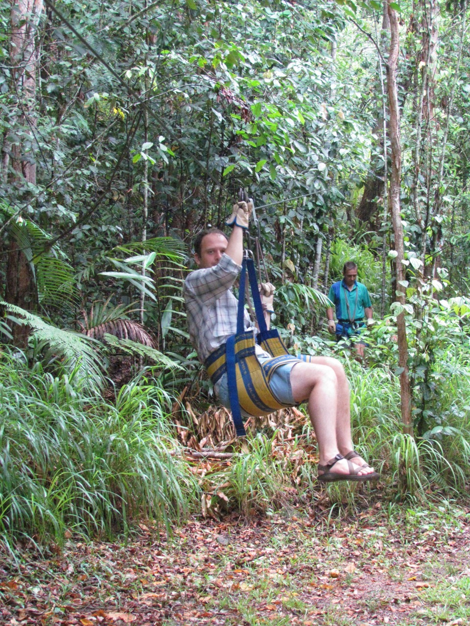 We tried some ziplining while we were in Eungella National Park. Don’t be fooled by the photos above…Sam is just on the practice zip line where you learn the knack of it. The real deal is 50 feet up and gives you fantastic views out over the rainforest, and has you right up amongst the resting fruit bats – so close you can see their babies clinging on for dear life, and probably closer than our lack of rabies vaccination probably warranted.